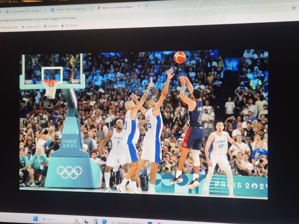 This photo of Steph Curry (in dark blue) guarded by 2 big French basketball players was taken from the 2024 Paris Olympics. This extremely difficult 3-point shot went in.