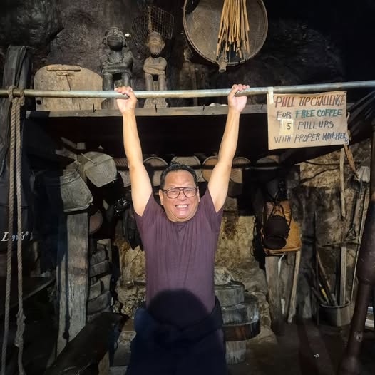 The sign says, “15 pull-ups and you will get FREE COFFEE”. There is a pull-up challenge inside a native coffee shop in the middle of Sagada forest.